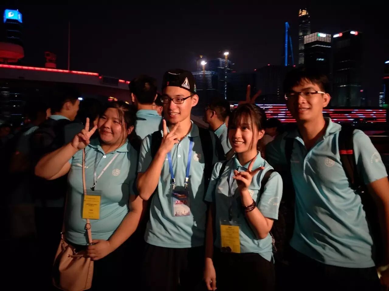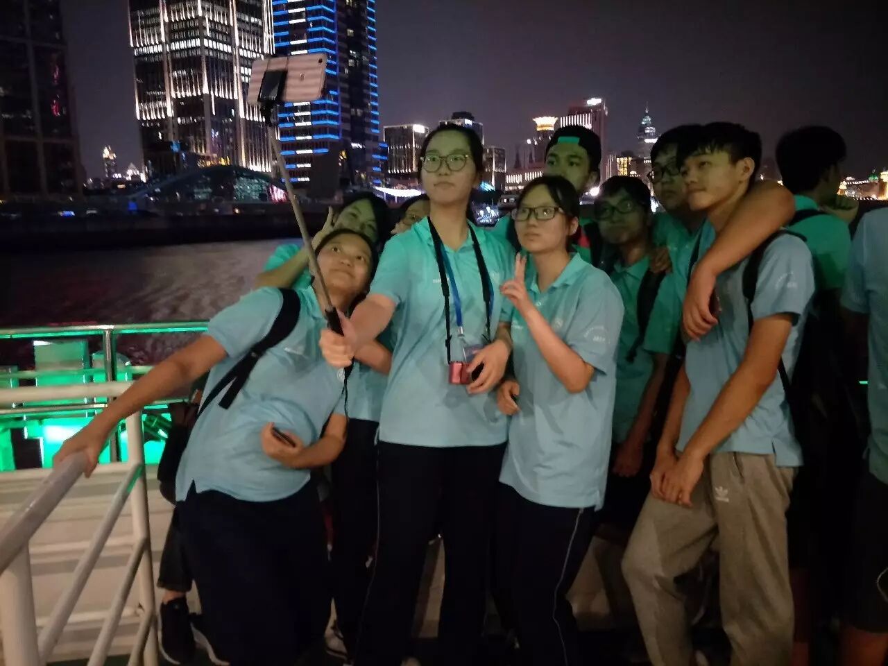 洋泾中学的志愿者们热情地为香港学生介绍着浦江两岸的建筑。他们将浦东的金茂大厦、环球金融中心、上海中心戏称为“注射器”、“开瓶器”、“打蛋器”。也有不少初次夜游浦江的洋中学子,兴奋地欣赏着浦西的万国建筑展。一些香港学生和志愿者们触景生情,唱起了《上海滩》、《夜上海》等经典曲目,这曲《夜上海》的作者,正是洋泾中学1930年代艺术教师陈歌辛先生,同学们恍若在两岸霓虹相映中跨越了时空,触摸到上海文化的历史与未来。